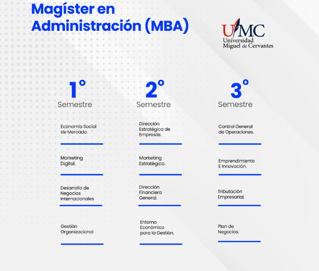 El programa de Magíster en Administración de Empresas (MBA), responde a la necesidad de desarrollar en los estudiantes habilidades avanzadas en gestión y dirección de empresas, proporcionando conocimientos teóricos y prácticos que les permitan liderar organizaciones de manera efectiva en un entorno competitivo y en constante cambio. Está diseñado para ofrecer una formación integral y avanzada en gestión empresarial, orientada a la creación de líderes capaces de enfrentar los desafíos del entorno global actual. A través de un enfoque multidisciplinario, el programa combina conocimientos teóricos y prácticos en áreas clave como estrategia, finanzas, marketing, operaciones, recursos humanos, entre otros.