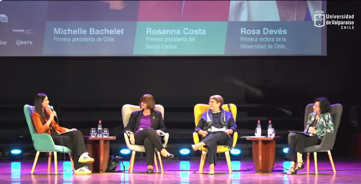 El encuentro, titulado “A veinte años del primer gobierno paritario presidido por una mujer”, contó con la participación de la expresidenta Michelle Bachelet, la presidenta del Banco Central Rosanna Costa y la rectora de la Universidad de Chile Rosa Devés, junto a exministras y exautoridades que integraron el primer gabinete paritario instaurado en 2006.