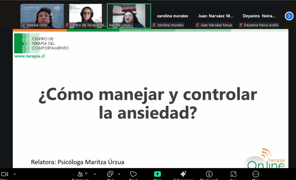 El Centro de Terapia del Comportamiento ofreció la charla online “¿Cómo manejar y controlar la ansiedad?”, dictada por la psicóloga Maritza Urzúa, especialista en terapia cognitivo-conductual y dialéctica, con más de 15 años de experiencia clínica en adolescentes y adultos. La exposición entregó herramientas prácticas para comprender y afrontar la ansiedad.